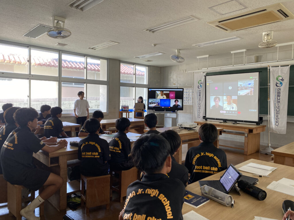 講師は、現在もオーストラリアで活躍する酒井宏樹選手、元日本代表の大津祐樹さんのお二人をオンラインで石垣島、東京、オーストラリアを繋ぎ、遠隔指導を行っていただきました。
